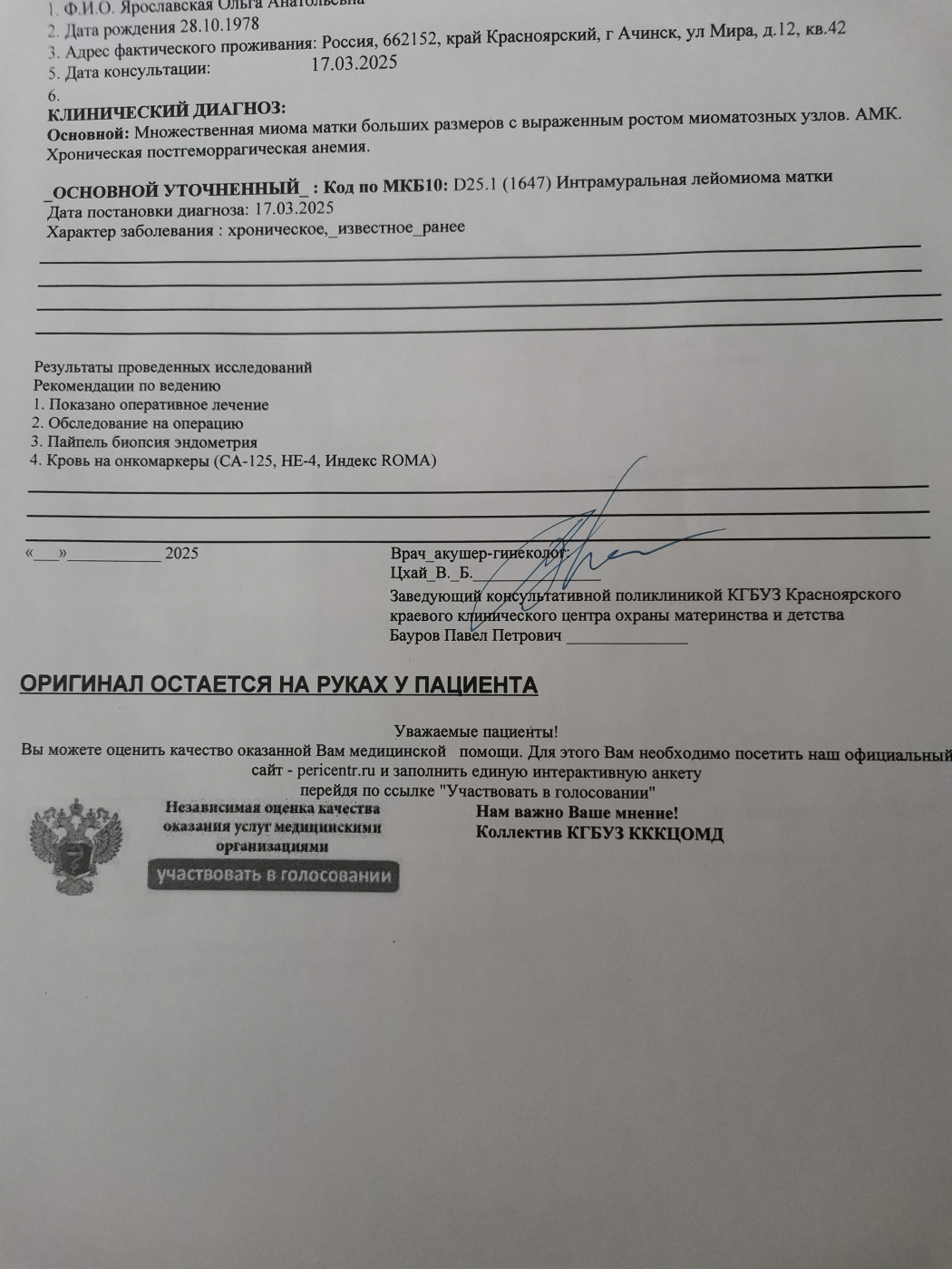 Здравствуйте! Скажите, пожалуйста, мне предстоит операция по удалению матки. Но мне её откладывают уже почти год по причине низкого гемоглобина (70). За это время было сделано 2 выскабливания. Потом переливание крови, капельницы с венофером, но гемоглобин поднимался и тут же падал, потому что кровотечения были такими, что не передать словами. В октябре… |