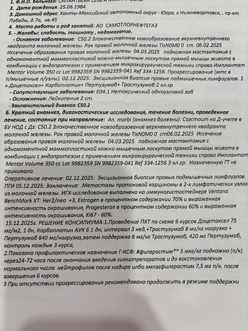 Верно ли назначена химиотерапия и нужно ли ставить порт систему?Здравствуйте. Ольга, 41 лет. Рмж TisN0M0 0ст. В В марте 2025 выполнена мастэктомия с одномоментной установкой импланта. Декабрь 2025 прогрессирование МТС в л/узлы и удаление. Назначена химиотерапия: 6 курсов доцетаксел+карбоплатин и трастузумаб+пертузумаб. При отсутствии прогрессирования в режиме поддержки пертузумаб+трастузумаб. А сколько курсов поддержки никто не говорит. |