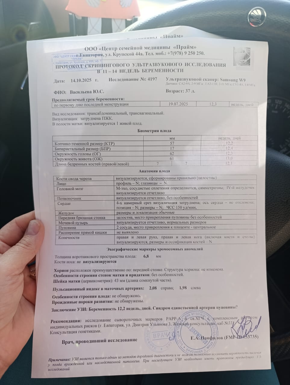 Добрый день! Сделала первый скрининг, все впорядке кроме кости носа она 1,5мм и воротникового пространства 2,5мм. акушерских недель 12,5, а по узи 13,1. Врач узи меня меня успокаивал, говоря что возможно просто у малыша маленький носик, ведь у меня совсем не большой, но мне нет покоя.... кровь сдала, но результаты будут через 10 дней. Боюсь изведу себя… |