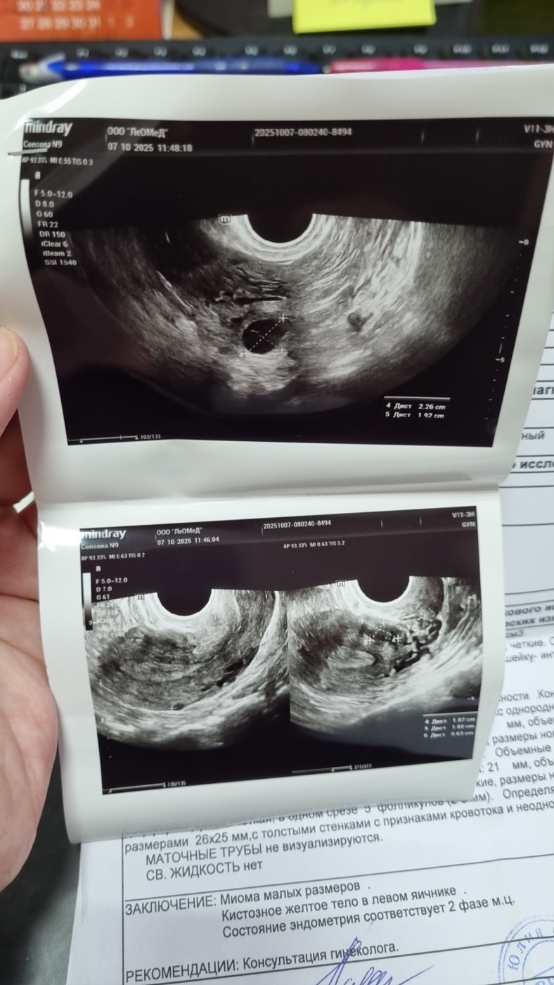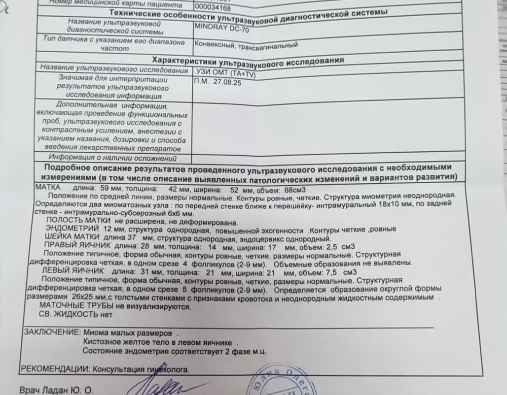 Здравствуйте. Данных за беременность не выявлено. Имеет место миома, киста желтого тела. Если есть основания предполагать беременность, выполните тест или анализ крови на ХГЧ. |